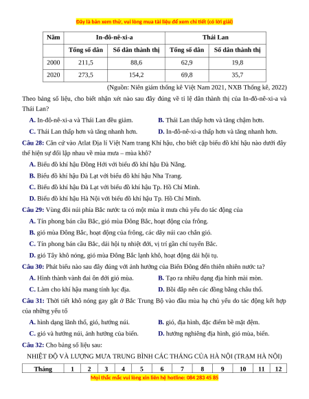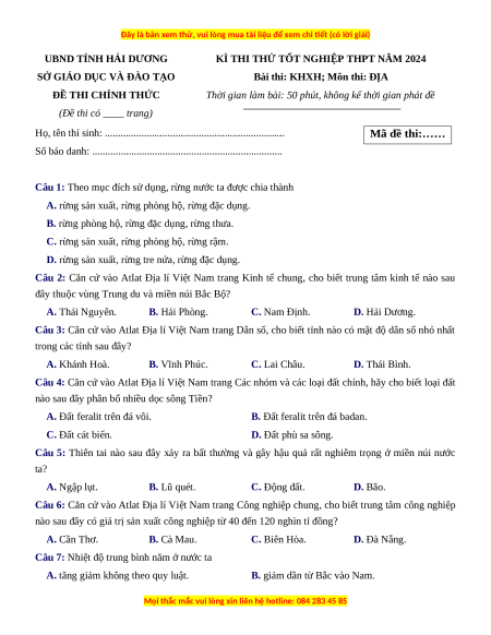 Đề thi thử tốt nghiệp Địa lí Sở GD&ĐT Hải Dương lần 2 năm 2024