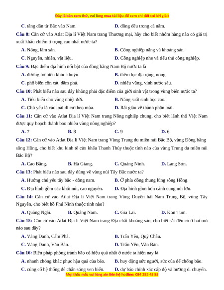 Câu 8: Căn cứ vào Atlat Địa lí Việt Nam trang Thương mại, hãy cho biết nhóm hàng nào có giá trị