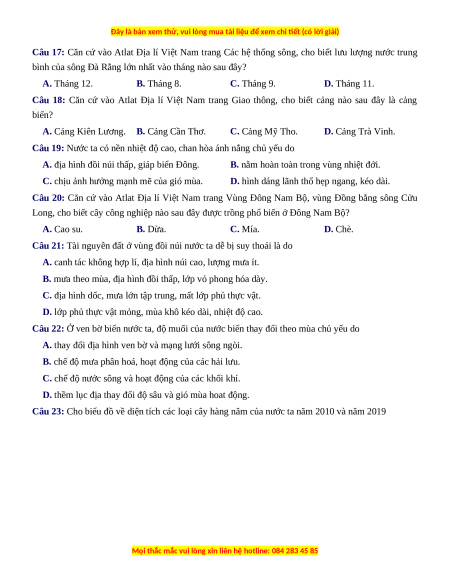 Câu 17: Căn cứ vào Atlat Địa lí Việt Nam trang Các hệ thống sông, cho biết lưu lượng nước trung