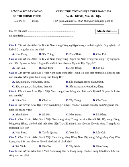 Đề thi thử tốt nghiệp Địa lí Sở Giáo dục Đăk Nông năm 2024
