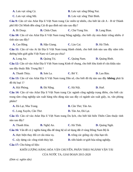 Câu 7: Căn cứ vào Atlat Địa lí Việt Nam trang vùng Đông Nam Bộ, vùng Đồng bằng sông Cửu