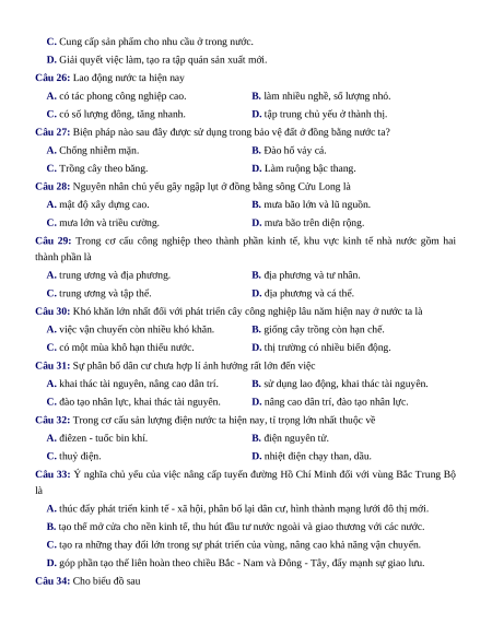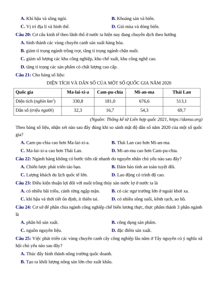 Câu 25: Việc phát triển các vùng chuyên canh cây công nghiệp lâu năm ở Tây nguyên có ý nghĩa xã