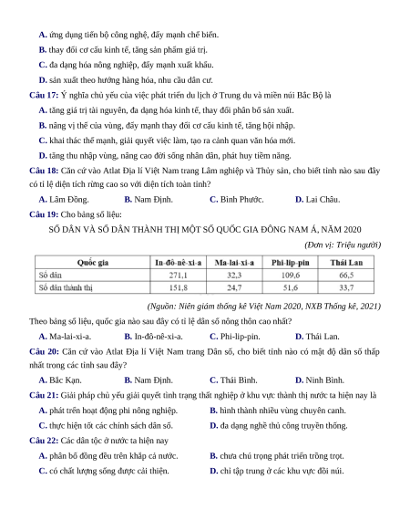 Câu 20: Căn cứ vào Atlat Địa lí Việt Nam trang Dân số, cho biết tỉnh nào có mật độ dân số thấp