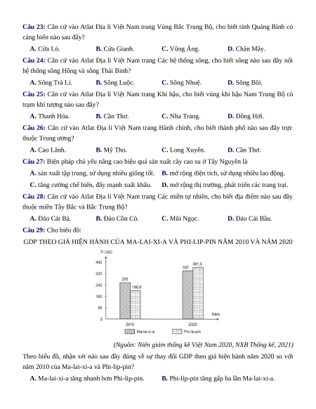 Câu 23: Căn cứ vào Atlat Địa lí Việt Nam trang Vùng Bắc Trung Bộ, cho biết tỉnh Quảng Bình có cảng biển nào sau đây? A. Cửa Lò. B. Cửa Gianh. C. Vũng Áng. D. Chân Mây.