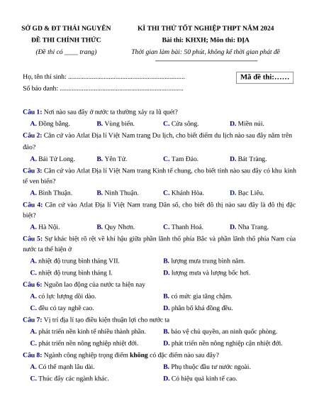 Đề thi thử tốt nghiệp Địa lí Sở Thái Nguyên năm 2024