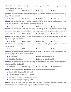 Câu 3: Căn cứ vào Atlat Địa lí Việt Nam trang Kinh tế chung, cho biết tỉnh nào sau đây có khu kinh tế ven biển? A. Bình Thuận. B. Ninh Thuận. C. Khánh Hòa. D. Bạc Liêu.