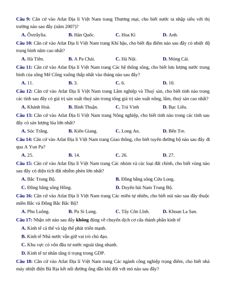 Câu 9: Căn cứ vào Atlat Địa lí Việt Nam trang Thương mại, cho biết nước ta nhập siêu với thị