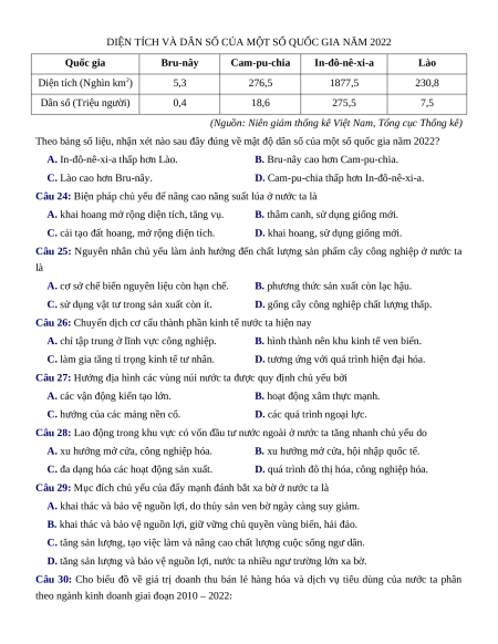DIỆN TÍCH VÀ DÂN SỐ CỦA MỘT SỐ QUỐC GIA NĂM 2022 Quốc gia Bru-nây Cam-pu-chia In-đô-nê-xi-a Lào Diện tích (Nghìn km2) 5,3 276,5 1877,5 230,8 Dân số (Triệu người) 0,4 18,6 275,5 7,5