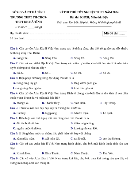 Đề thi thử tốt nghiệp Địa lí trường TH - THCS - THPT ĐH Hà Tĩnh lần 1 năm 2024