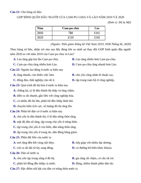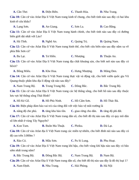 Câu 20: Căn cứ vào Atlat Địa lí Việt Nam trang dân số, cho biết đô thị nào sau đây là đô thị loại 1? A. Nam Định. B. Nha Trang. C. Hải Phòng. D. Hà Nội