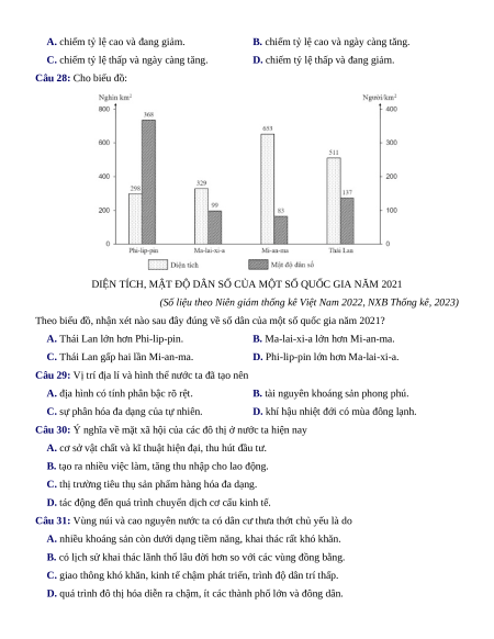 Câu 29: Vị trí địa lí và hình thể nước ta đã tạo nên