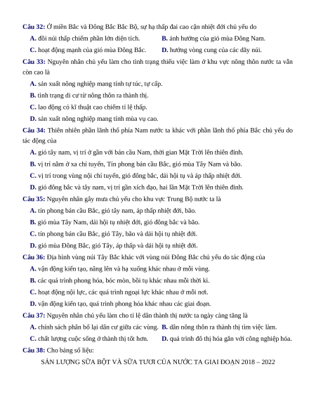 Câu 19: Căn cứ vào Atlat Địa lí Việt Nam trang khí hậu, cho biết vùng khí hậu nào sau đây có bão sớm nhất trong năm? A. Bắc Trung Bộ. B. Đông Bắc Bộ. C. Nam Trung Bộ. D. Nam Bộ.
