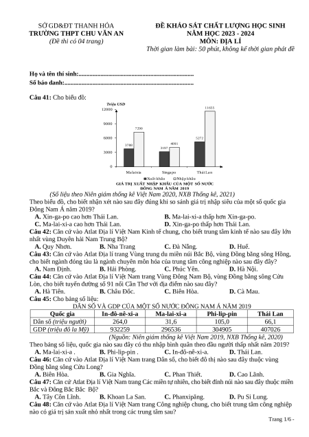 Câu 41: Cho biểu đồ: Triệu USD 11655 12000 9000 7290 6000 5272 3788 4091 3197 3000 0 Malaixia Singapo Thái Lan Xuất khẩu Nhập khẩu
