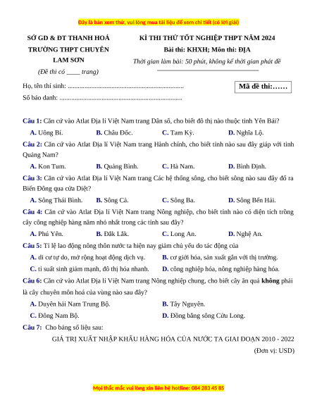 Đề thi thử tốt nghiệp Địa lí trường THPT Chuyên Lam Sơn lần 1 năm 2024