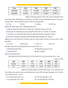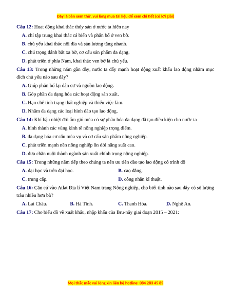 Câu 16: Căn cứ vào Atlat Địa lí Việt Nam trang Nông nghiệp, cho biết tỉnh nào sau đây có số lượng trâu nhiều hơn bò? A. Lai Châu. B. Hà Tĩnh. C. Thanh Hóa. D. Nghệ An.