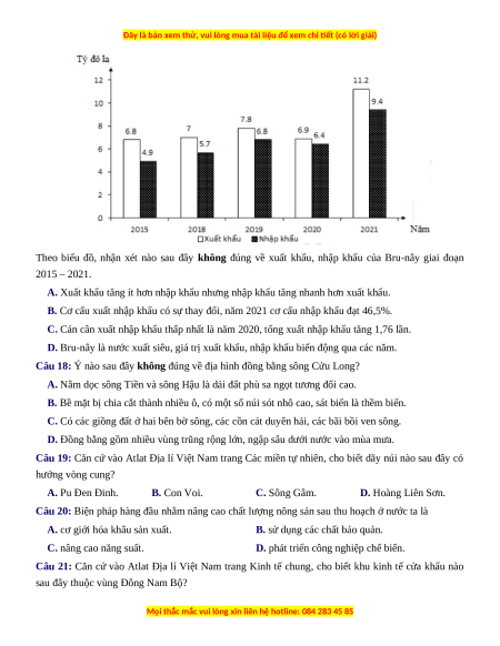 Câu 17: Cho biểu đồ về xuất khẩu, nhập khẩu của Bru-nây giai đoạn 2015 – 2021:
