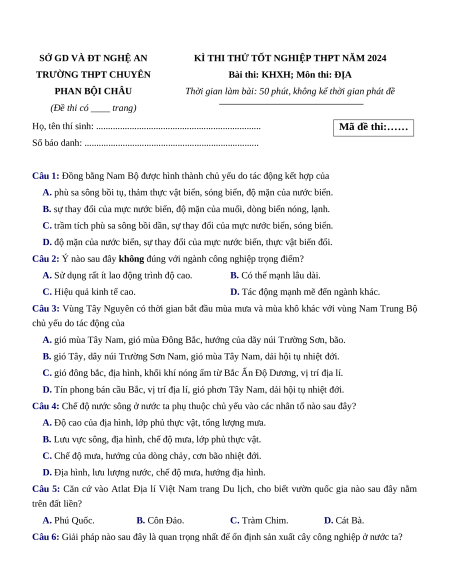 Đề thi thử tốt nghiệp Địa lí trường THPT Chuyên Phan Bội Châu lần 1 năm 2024