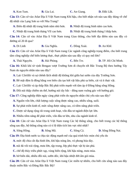 Câu 14: Căn cứ vào Atlat Địa lí Việt Nam trang Giao thông, cho biết địa điểm nào sau đây có đường số 20 đi qua? A. Di Linh B. Gia Nghĩa. C. Đồng Xoài. D. An Khê.
