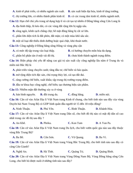 Câu 12: Hạn chế chủ yếu trong sử dụng hợp lí và cải tạo tự nhiên ở Đồng bằng sông Cửu Long là