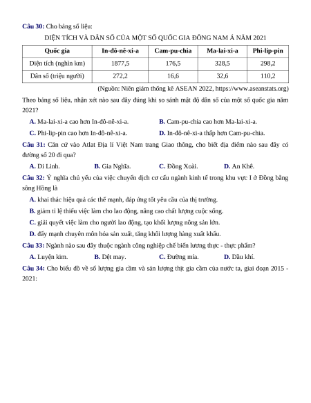 Câu 26: Căn cứ vào Atlat Địa lí Việt Nam trang Các miền tự nhiên, cho biết đỉnh núi nào sau đây có độ cao trên 2500m? A. Phu Hoạt. B. Phu Pha Phong. C. Chí Linh. D. Pu Xai Lai Leng.