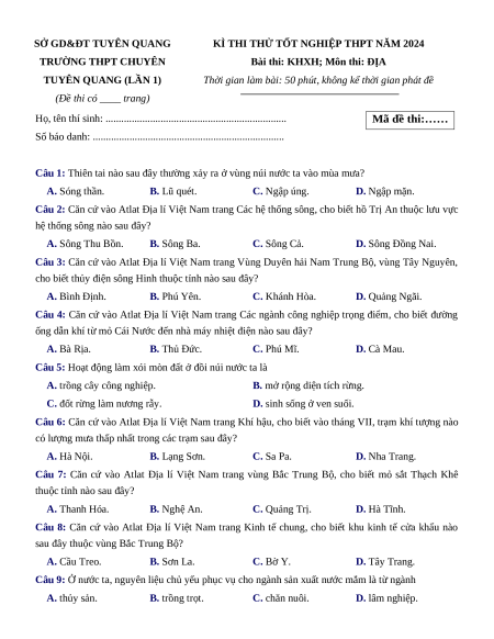 Đề thi thử tốt nghiệp Địa lí trường THPT Chuyên Tuyên Quang năm 2024