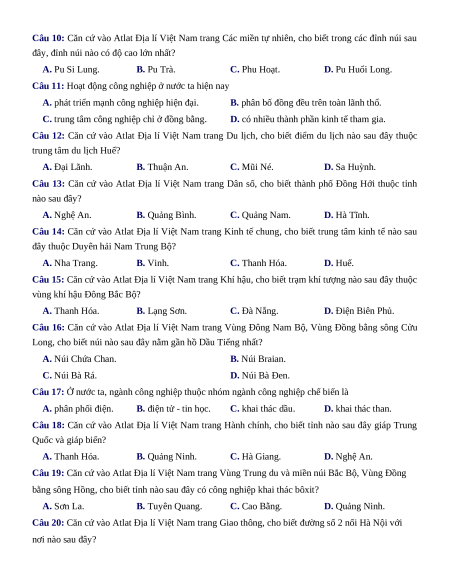 Câu 12: Căn cứ vào Atlat Địa lí Việt Nam trang Du lịch, cho biết điểm du lịch nào sau đây thuộc trung tâm du lịch Huế? A. Đại Lãnh. B. Thuận An. C. Mũi Né. D. Sa Huỳnh.