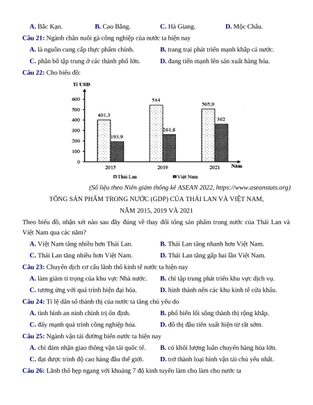 Câu 20: Căn cứ vào Atlat Địa lí Việt Nam trang Giao thông, cho biết đường số 2 nối Hà Nội với nơi nào sau đây? A. Bắc Kạn. B. Cao Bằng. C. Hà Giang. D. Mộc Châu.