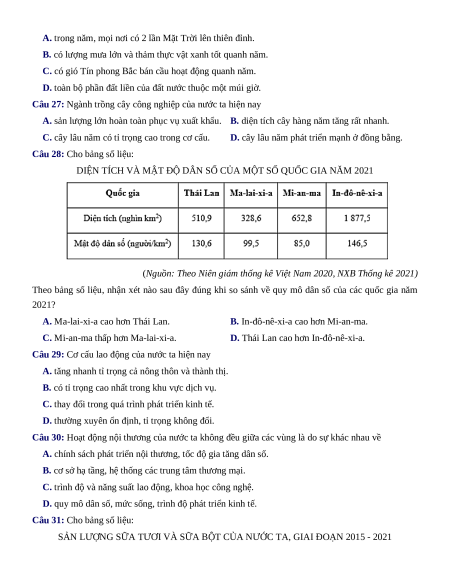 Câu 26: Lãnh thổ hẹp ngang với khoảng 7 độ kinh tuyến làm cho làm cho nước ta