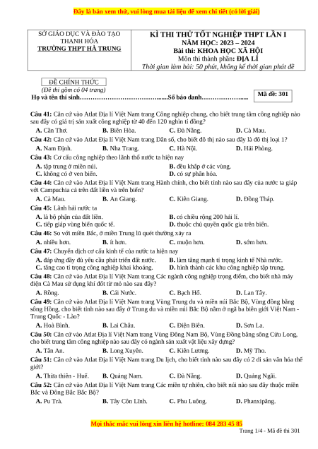 Đề thi thử tốt nghiệp Địa lí trường THPT Hà Trung lần 1 năm 2024