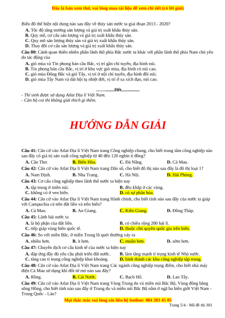 Câu 54: Căn cứ vào Atlat Địa lí Việt Nam trang Khí hậu, cho biết nơi nào sau đây có lượng mưa lớn nhất vào tháng XI? A. Hoàng Sa. B. Cần Thơ. C. Trường Sa. D. Thanh Hóa.
