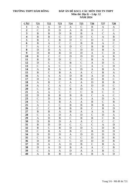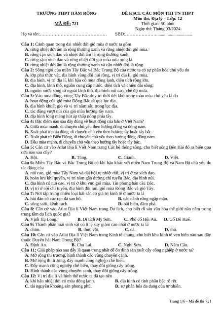 Môn thi: Địa lý – Lớp: 12 MÃ ĐỀ: 721 Thời gian: 50 phút Ngày thi: Tháng 03/2024