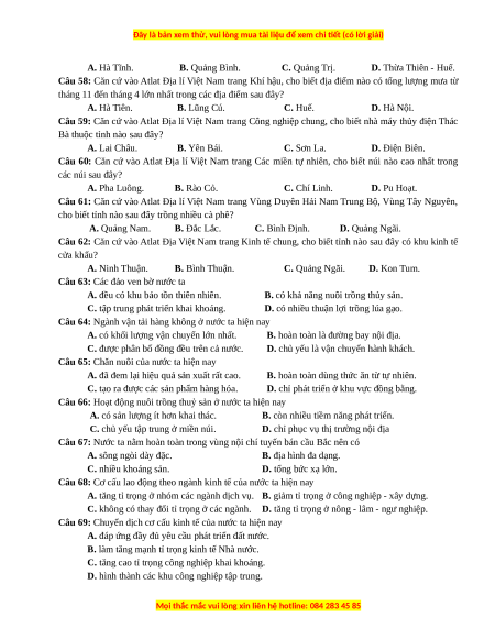 Câu 62: Căn cứ vào Atlat Địa Việt Nam trang Kinh tế chung, cho biết tỉnh nào sau đây có khu kinh tế cửa khẩu? A. Ninh Thuận. B. Bình Thuận.