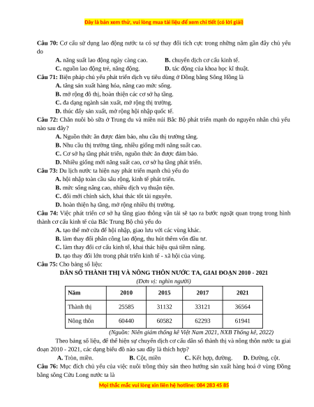 Câu 76: Mục đích chủ yếu của việc nuôi trồng thủy sản theo hướng sản xuất hàng hoá ở vùng Đồng