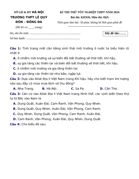 Đề thi thử tốt nghiệp Địa lí trường THPT Lê Quý Đôn - Hà Nội năm 2024