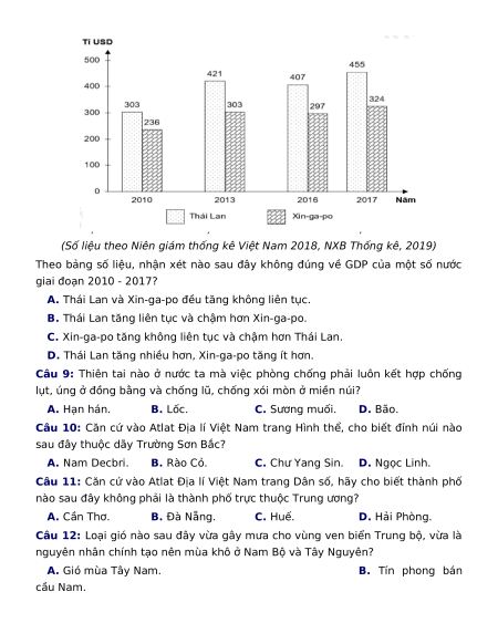 Câu 8: Cho biểu đồ: Qui mô GDP của Xin-ga-po và Thái Lan qua các năm: