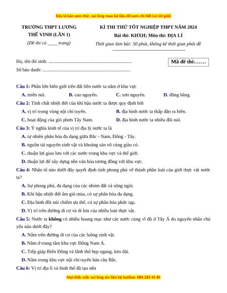 Đề thi thử tốt nghiệp Địa lí trường THPT Lương Thế Vinh lần 1 năm 2024