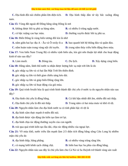 Câu 22: Nguyên nhân nào sau đây là chủ yếu làm cho Cà Ná và Sa Huỳnh trở thành vùng sản xuất