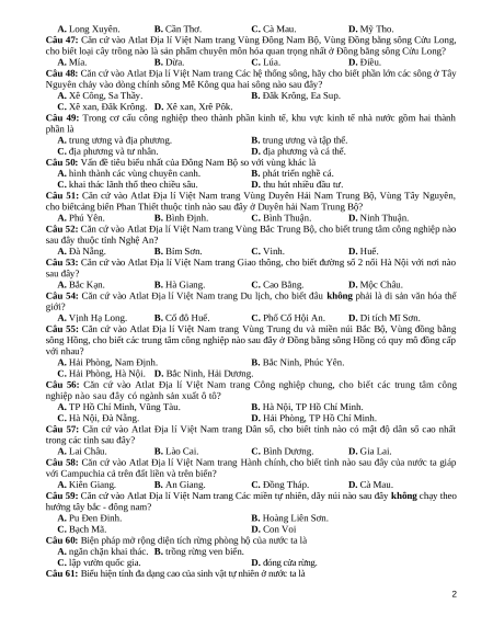 Câu 47: Căn cứ vào Atlat Địa lí Việt Nam trang Vùng Đông Nam Bộ, Vùng Đồng bằng sông Cửu Long,