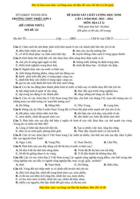 Đề thi thử tốt nghiệp Địa lí trường THPT Triệu Sơn 3 lần 1 năm 2024