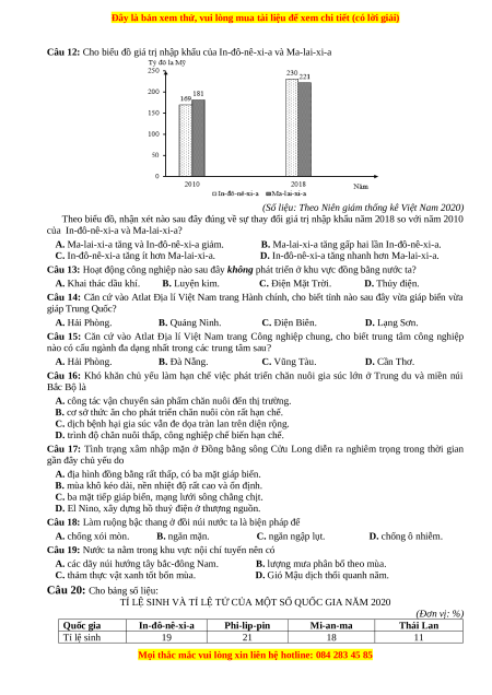 Câu 12: Cho biểu đồ giá trị nhập khẩu của In-đô-nê-xi-a và Ma-lai-xi-a