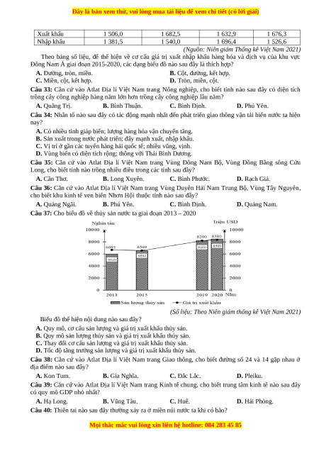 Câu 37: Cho biểu đồ về thủy sản nước ta giai đoạn 2013 – 2020