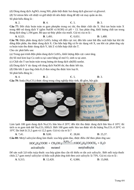 Câu 79: Soda (Na2CO3) được dùng trong công nghiệp thủy tinh, đồ gốm, bột giặt.