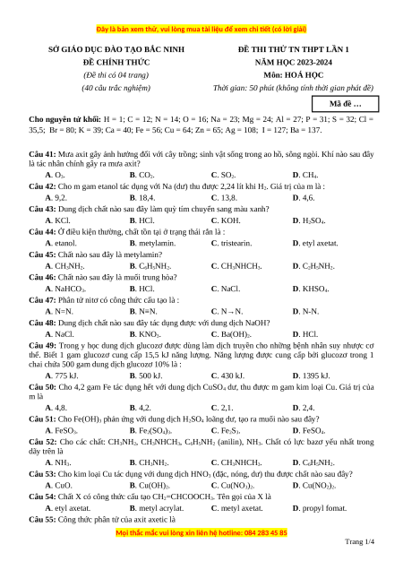 Đề thi thử tốt nghiệp Hóa học Sở GDĐT Bắc Ninh lần 3 năm 2024