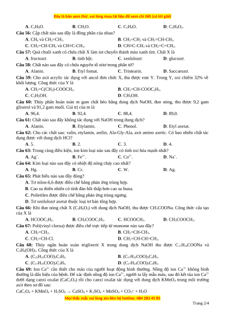 Câu 58: Chất nào sau đây có chứa nguyên tố nitơ trong phân tử? A. Alanin. B. Etyl fomat. C. Tristearin. D. Saccarozơ.