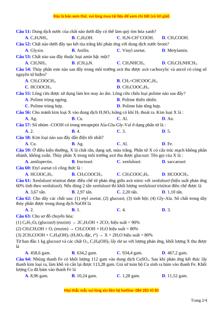 Câu 59: Ở điều kiện thường, X là chất rắn, dạng sợi, màu trắng. Phân tử X có cấu trúc mạch không phân