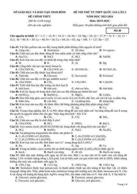 Đề thi thử tốt nghiệp Hóa học Sở GD&ĐT Ninh Bình lần 2 năm 2024