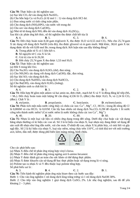 Câu 75: Nhựa là một loại vật liệu có nhiều ứng dụng trong đời sống. Dưới đáy chai hoặc các vật dụng