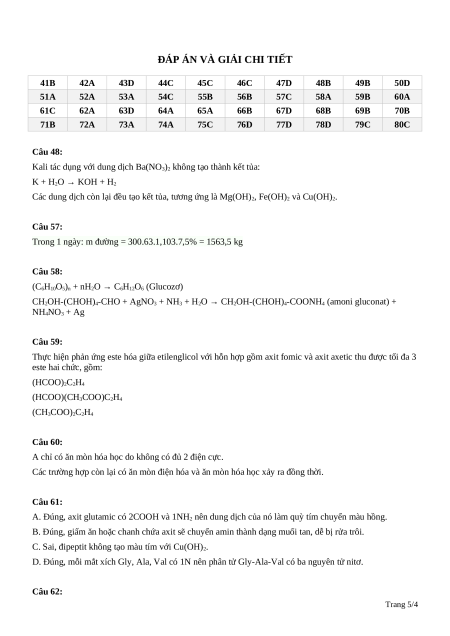 Câu 48: Kali tác dụng với dung dịch chất nào sau đây không tạo thành kết tủa? A. Fe(NO3)2. B. Ba(NO3)2. C. MgCl2. D. CuSO4.