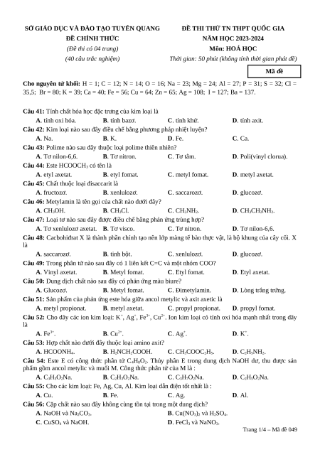 Đề thi thử tốt nghiệp Hóa học Sở GD&ĐT Tuyên Quang lần 1 năm 2024