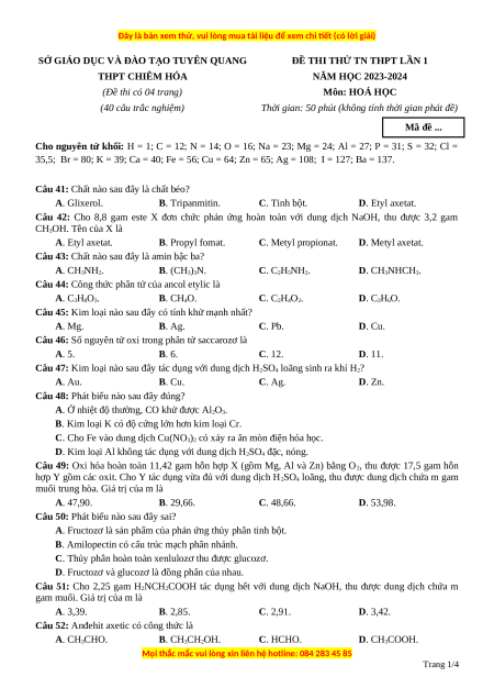 ĐỀ THI THỬ TN THPT LẦN 1 THPT CHIÊM HÓA NĂM HỌC 2023-2024